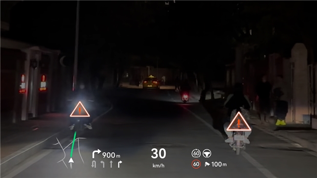 除辅助驾驶功能优化外,问界M8的AR-HUD系统也迎来功能升级,新增麒麟领航动效、风险预警及车道指引三大实用功能。夜间行驶时,光线昏暗、视野不佳,AR-HUD风险预警功能可实时识别视野范围内的行人和非机动车,并及时发出告警提示,帮助驾驶员精准判断安全风险;开启AR车道指引功能后,人驾状态下导航启动时,AR-HUD会在路面投射AR引导光毯,路口处则通过AR箭头进行清晰指引,直观呈现行驶路线,大幅降低复杂路况下的驾驶难度,让夜间出行更安心。